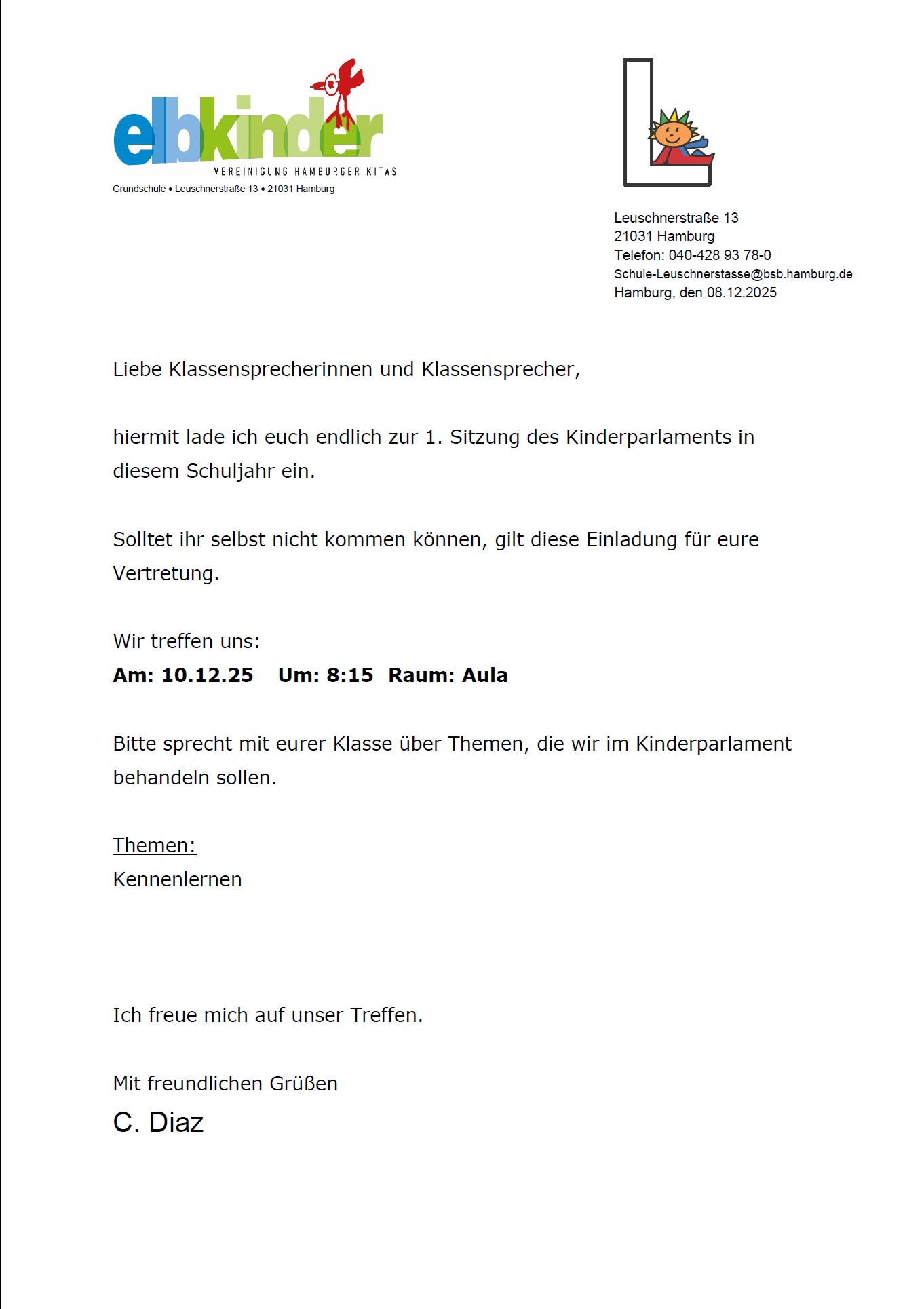 Das Kinderparlament ist die Vertretung aller Klassen an der Schule Leuschnerstraße. Jede Klasse entsendet zwei Klassensprecher, die in der Sitzung die Belange der Klassen vertreten und Ergebnisse der Sitzung wieder in die Klassen zurückbringen. Als Vertreter der Schule nimmt der Schulleiter, Herr Macheit, an der Sitzung teil.